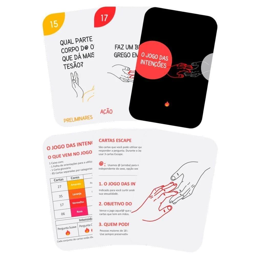 O Jogo das Intenções é um baralho com 85 cartas eróticas para você falar sobre a sua sexualidade e fazer sexo com quem quiser, do jeito que quiser, sem preconceitos e receio de dar vazão aos desejos e fantasias.