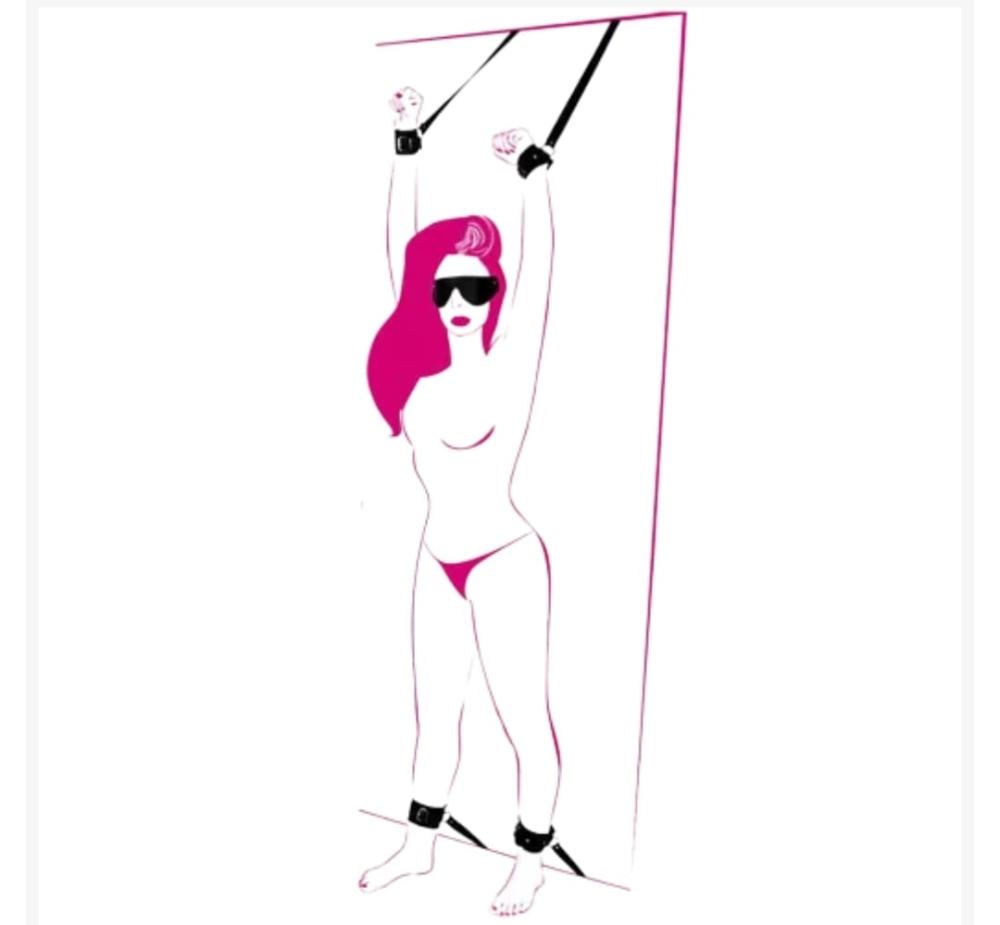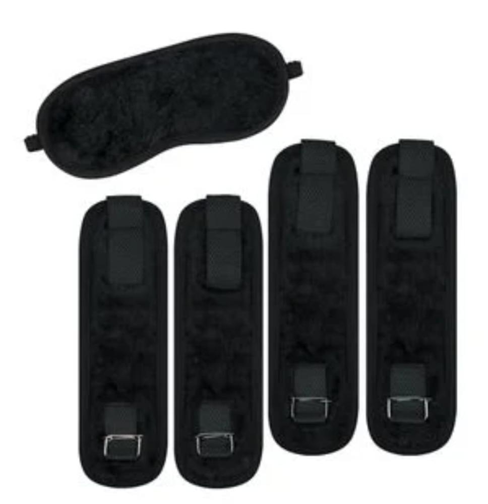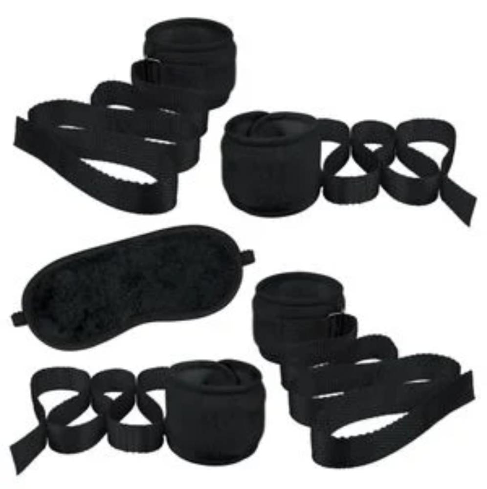 Contém: 2 amarras braceletes para os braços, 2 amarras para os Tornozelos e 1 venda para olhos.