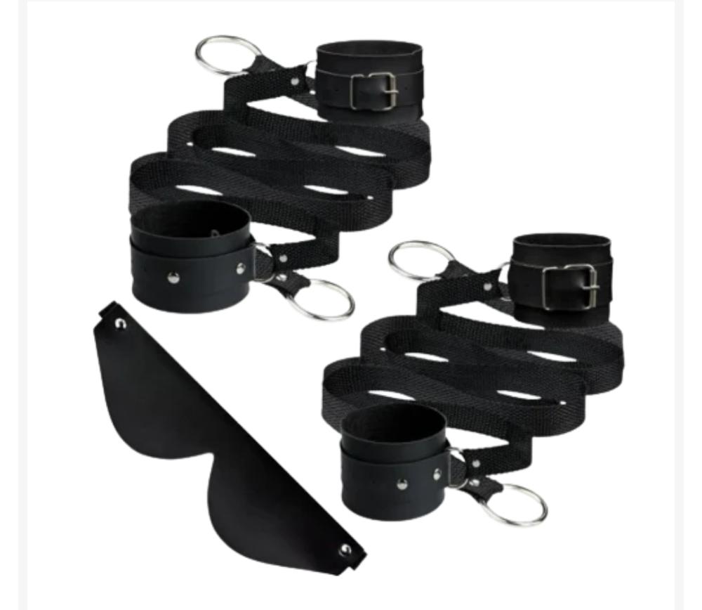 Possui: 2 amarras braceletes para os braços, 2 amarras para os tornozelos e 1 venda tapa olhos.