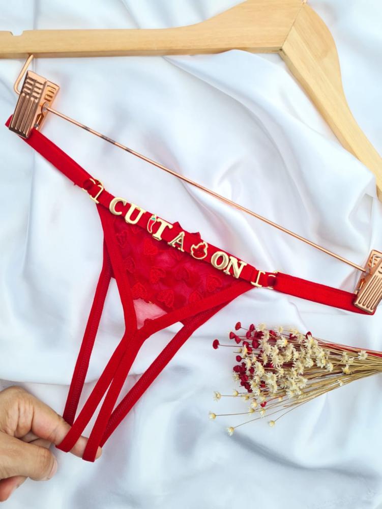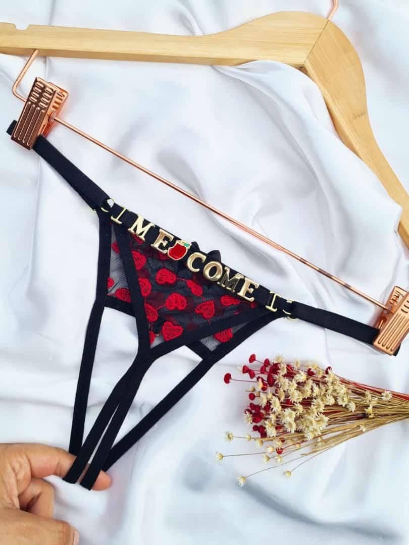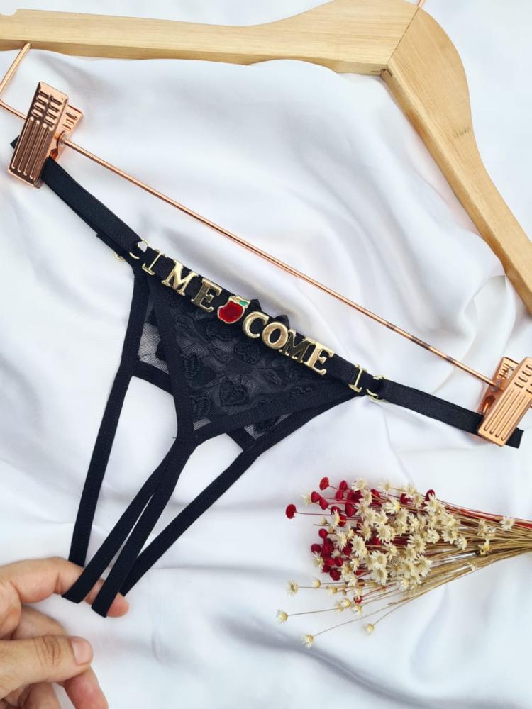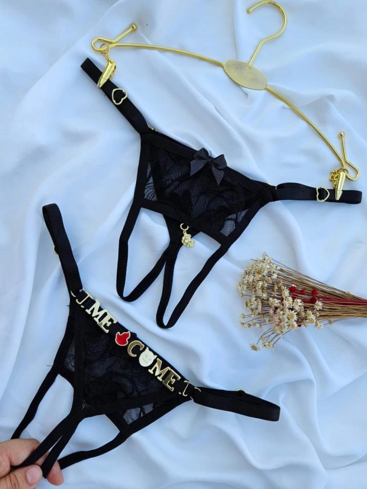 Calcinha modelo secretária com detalhe em pingente na parte da frete (pingente pode variar) e abertura na parte baixa. Personalize com a palavra/frase que quiser ou use sem personalizar como desejar.